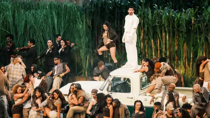 Qui arriva la parte più interessante, perché il palco è costruito come una specie di cartolina viva, trasformato in una sequenza di ambienti che richiamano paesaggi tropicali, campi di canna da zucchero, bodegas, bar di quartiere e spazi di socialità quotidiana. Un percorso che si apre e si richiude, con Bad Bunny che si muove tra diverse “isole” visive.